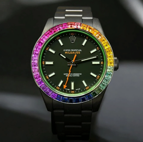 I discovered these abominations in my search for a cheap Milgauss (I didn't find one), these iced out bezels are courtesy of the Geneva Watch Co. (Chrono24 - links way below) and they are not cheap, regardless of the way they look. They are very not okay, not on a Milgauss, the scientists watch. Is the green one ok, at least it mirrors the green crystal - no, no it's not ok.
